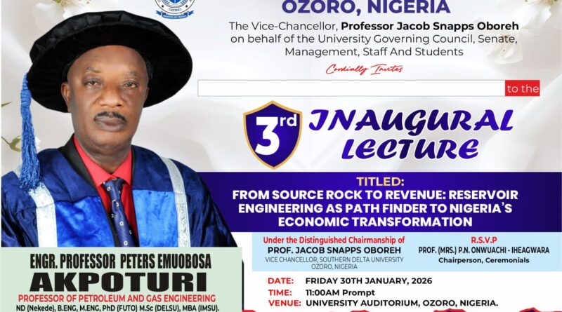 The inaugural lecture delivered at Southern Delta University, Ozoro, by Engr. Professor Peters Emuobosa Akpoturi, Professor of Petroleum and Gas Engineering, offers a timely and intellectually rigorous intervention in Nigeria’s long-running debate about resource wealth and economic underperformance. Titled “From Source Rock to Revenue: Engineering as Pathfinder to Nigeria’s Economic Transformation,” the lecture reframes Nigeria’s hydrocarbon challenge not as a question of abundance, but of engineering conversion, value optimization and long-term stewardship.